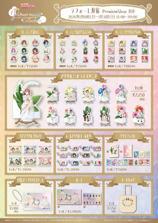「ニジガクフラワーミュージック」企画の新曲衣装姿の描き下ろしを使用した新商品が多数登場