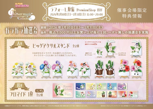 株式会社バンダイナムコフィルムワークスは、『ラブライブ!虹ヶ咲学園スクールアイドル同好会』のポップアップストア“FLOWER MUSIC COLLECTION”を、ラフォーレ原宿PremiumShop(東京都渋谷区)にて、2026年1月10日(土)より1月31日(土)まで開催します。また、あべのキューズモール2階 SHIBUYA109阿倍野店(大阪府大阪市阿倍野区)にて2026年2月28日(土)より3月8日(日)まで開催いたします。