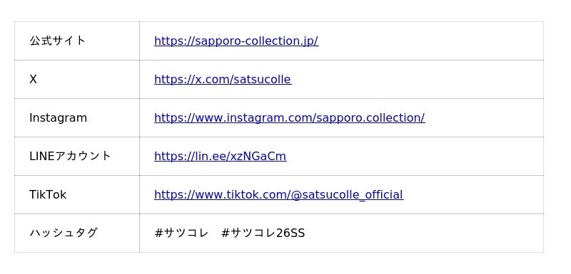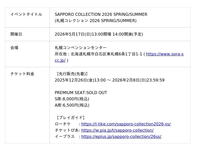2007年より開催している北海道最大級のファッションイベント『SAPPORO COLLECTION 2026 SPRING/SUMMER』(略称:『サツコレ2026SS』)を、2026年5月17日(日)に札幌市白石区の札幌コンベンションセンターで開催いたします。本日13:00よりチケット先行販売を開始し、第1弾出演者発表を行いました。