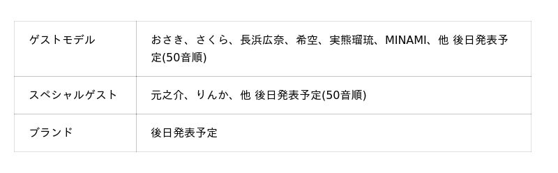 ゲストモデルとしておさき、さくら、長浜広奈、希空、実熊瑠琉、MINAMIの6名が、スペシャルゲストとして元之介、りんかの2名が出演いたします。