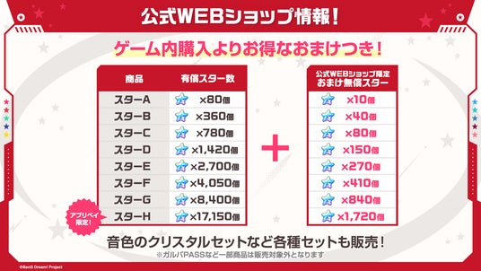 スターを公式WEBショップから購入すると、購入数に応じて公式WEBショップボーナスとして追加で無償スターを獲得することができます。