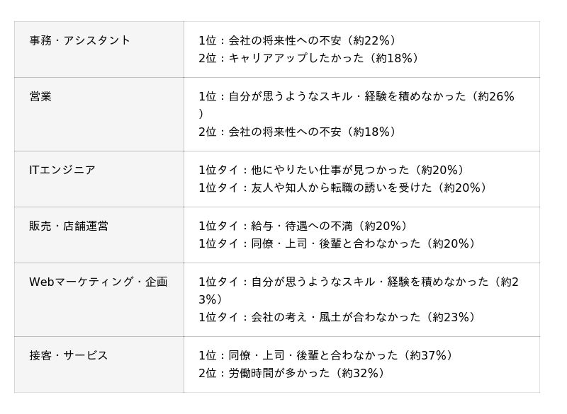 転職のきっかけを職種ごとにみてみると、不満の色が少しずつ違うことが見えてきました。必ずしも「給与や待遇面」に関することが1位になるとは、限らないようです。
