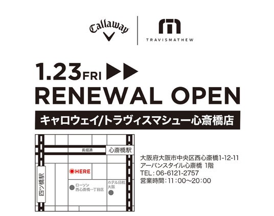 キャロウェイゴルフ株式会社(東京都港区南青山 代表取締役社長:庄司明久)は、フラッグシップストア「キャロウェイ/トラヴィスマシュー 心斎橋店」を、2026年1月23日(金)にリニューアルオープンします。