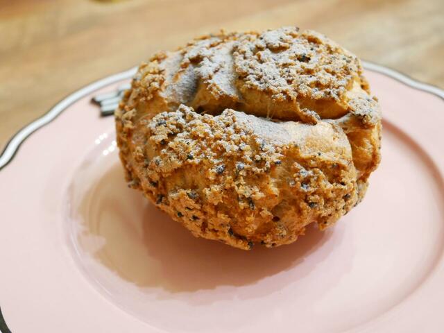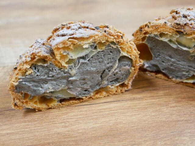 シュー皮の上はクロゴマでほんのりお化粧してあって、見た目からゴマ。中には香ばしい黒ゴマを混ぜたカスタードクリームがギュッと詰まっていて、ゴマ好きにはたまりません。