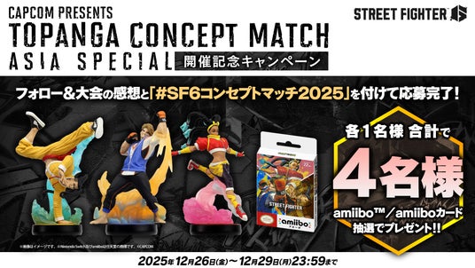 「Capcom presents TOPANGA CONCEPT MATCH Asia Special」の開催を記念して、amiibo(TM)、amiiboカードが抽選で当たるキャンペーンを実施!