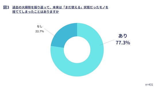 手間に加え、心の負担も大掃除の進行を妨げています。実際に、「過去の大掃除を振り返って、本来は『まだ使える』状態だったモノを捨ててしまったことはありますか」と聞いたところ、77.3%が「あり」と回答しました。
