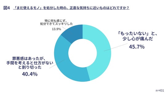 さらに、「まだ使えるモノ」を処分した時の気持ちを聞いたところ、「『もったいない』と、少し心が痛んだ」(45.7%)が最多となり、次いで「罪悪感はあったが、手間を考えると仕方がないと割り切った」(40.4%)が続きました。