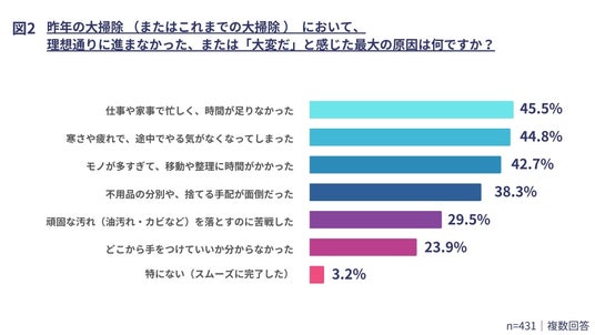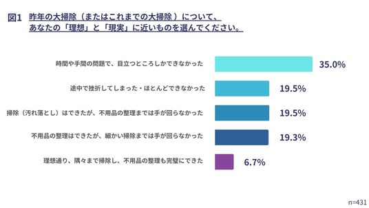 具体的な状況を見てみると、「時間や手間の問題で、目立つところしかできなかった」(35.0%)や、「掃除(汚れ落とし)はできたが、不用品の整理までは手が回らなかった」(19.5%)といった回答が続きました。