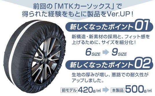そんな悩みを解決するのが、次世代の布製タイヤチェーン「MTK Car Socks II(カーソックス2)」です。2018年の改正チェーン規制にも対応しており、欧州の厳しい標準規格にも準拠した信頼のアイテムです。