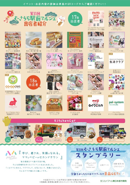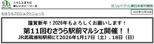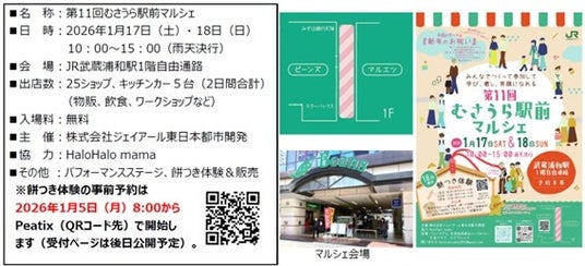 2026年1月17日(土)・18日(日)の2日間、JR武蔵浦和駅前にて地域で活動するHaloHalo mamaと連携し「第11回むさうら駅前マルシェ」を開催いたします。今回のテーマは「新年のお祝い」。前回ご好評をいただきました餅つき体験とつきたてのお餅を販売(18日(日)限定)するほか、寒さに負けない楽しいパフォーマンスやワークショップ、美味しいキッチンカーなどが集まります。家族や友人と一緒に、新年の空気を楽しむひとときをお過ごしください。みなさまのご来場をお待ちしています。