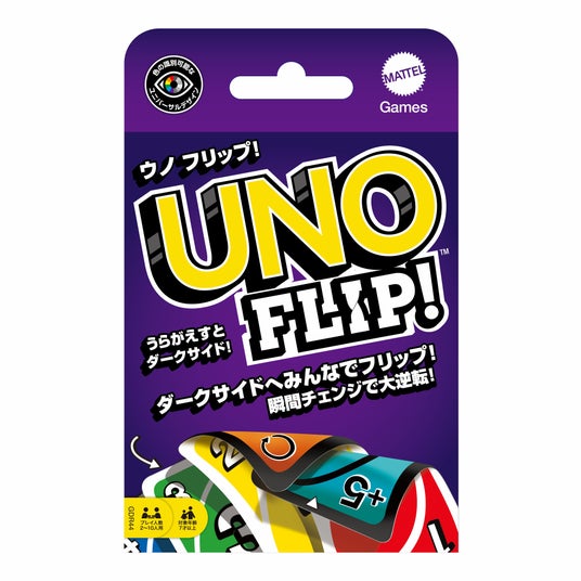 ライトサイド(表面)とダークサイド(裏面)、2つの側面がある新感覚のウノ。「フリップカード」を出すとダークサイドに突入、5枚引かなくてはいけない「ダークドロー5」カードなど、ハードモードに瞬間チェンジ。「ダークフリップ」カードを出すと、ライトサイドに戻るという駆け引きが楽しめるルール。