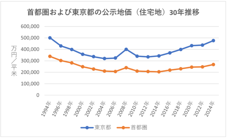 2026年のもう一つの焦点は、40代を中心とする2次取得層の動きです。首都圏および東京都の住宅地における公示地価の推移を見ると、2000年代後半から2010年前後にかけて土地価格は低水準で推移し、その後、2010年代後半以降は上昇基調に転じています。