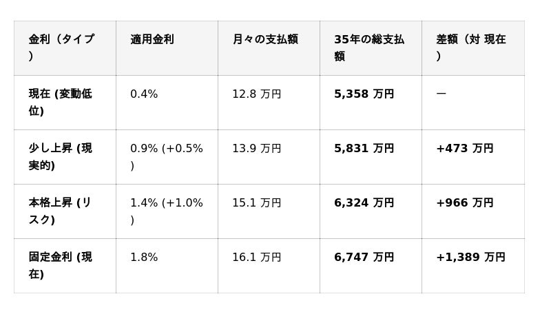 「これから先も上昇傾向」という前提に立つと、最も影響を受けるのは「総返済額」です。月々の支払いは数千円の差でも、35年トータルでは数百万円の差になります。