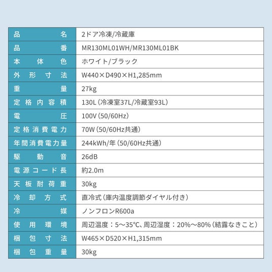 冷凍室37L・冷蔵室93Lの合計130Lと大容量なので、一人暮らしの方だけなく、二人暮らしの方でも無理なくお使いいただけます。