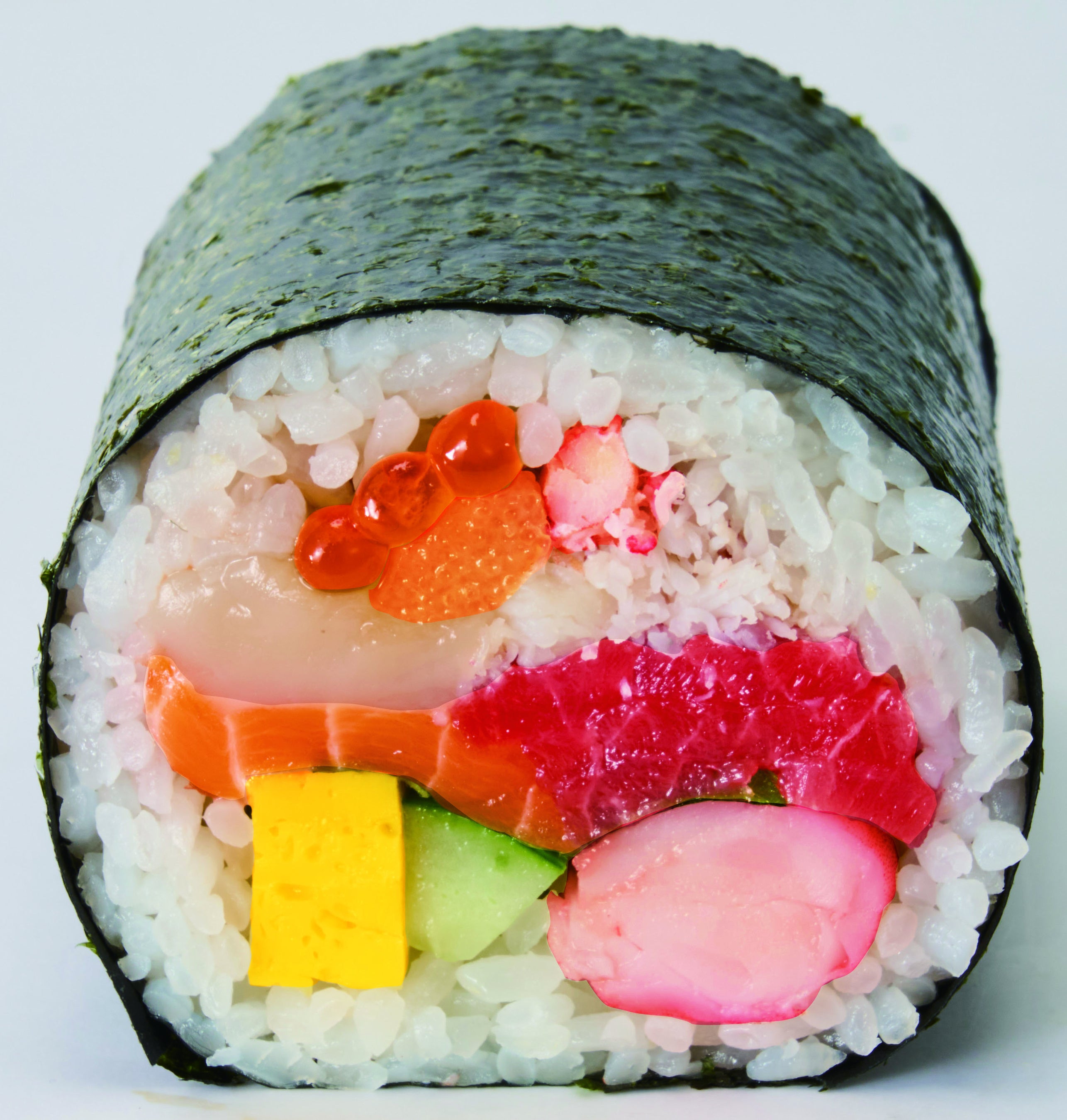 北海道産ホタテ、目鉢まぐろ、いくら、数の子、サーモン、海老、玉子焼、大葉、胡瓜