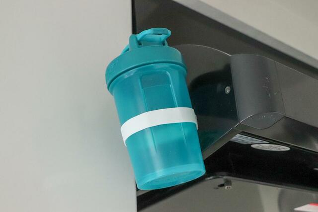 ほかにもタンブラーやプロテインのボトルを貼りつけておけるので、オフィスやジムなどでも役立ちそうです。