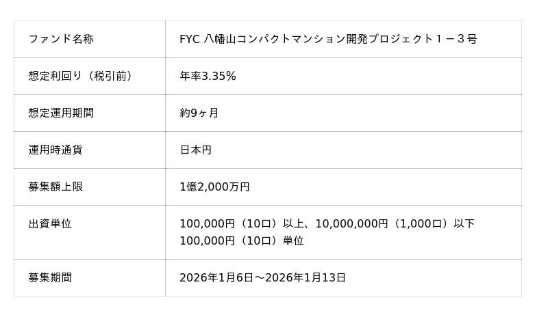 「未来をわかちあう投資」を提供する「Funvest(ファンベスト)」(以下、Funvest)は、「FYC 八幡山コンパクトマンション開発プロジェクト1-3号」(以下、本ファンド)の募集を1/6より開始しますので、お知らせいたします。