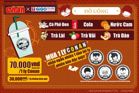 「名探偵コナン」とコラボしたノベルティ付きドリンクを期間限定で販売いたします。ご購入1点につき、オリジナルコースターがランダムで1枚付いてくるドリンクを販売いたします。・販売価格:70,000vnd(税込)約420円