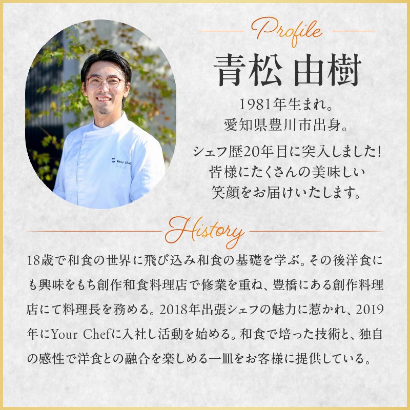 西尾市の特産品を、出張シェフが専用キッチンで仕込んだ本格的な料理を、ご自宅で仕上げて出来立てをご提供いたします。お料理はもちろん、後片付けまでお任せください。