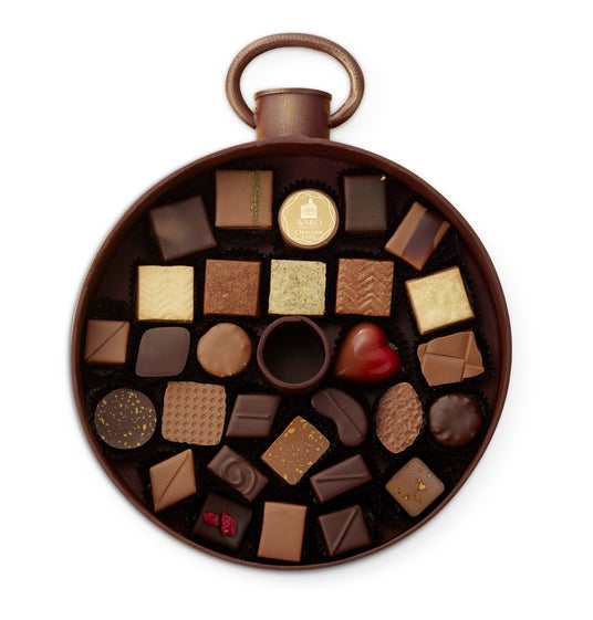 アルチザン ドゥ タンはフランス語で「時の職人」。 同じく職人が手がける懐中時計をイメージした、チョコレート細工です。精巧な⻭車やアラベスク模様をモチーフにした装飾の文字盤までお召し上がりいただけるチョコレートで表現し、開くと定番のショコラ・フレに加え、今季限定フレーバー「アロマ ジャポネ」、「SHIKI ショコラ・フレ−FUYU−」を含む29粒を贅沢に詰め合わせました。特別な季節にふさわしい、遊び心と技が光る驚きのひと品です。
