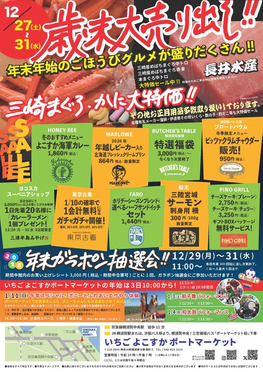 いちご よこすかポートマーケット(神奈川県横須賀市新港町6)の歳末大売出しがいよいよ始まります。年末年始のごちそうはいちご よこすかポートマーケット館内のレストランで楽しんでいただくもよし、特別な食卓をご馳走で彩るもよし、年に一度のこの機会をお楽しみください。