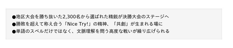 ※1スペリングビー:子どもたちを対象とした英単語のスペリング(つづり)力を競う大会。アメリカ、イギリス、カナダ、オーストラリア、ニュージーランドなど、世界各地でも開催されています。