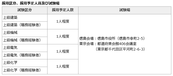- 上級機械(職務経験者含む)及び上級化学(職務経験者含む)については、現在選考中である令和7年度徳島市職員採用試験(随時募集)の同職種区分において、最終合格者数が採用予定人員に達した場合については、その時点で申込受付を中止するとともに、申込済であった場合でも採用試験を終了しますので予めご了承ください。