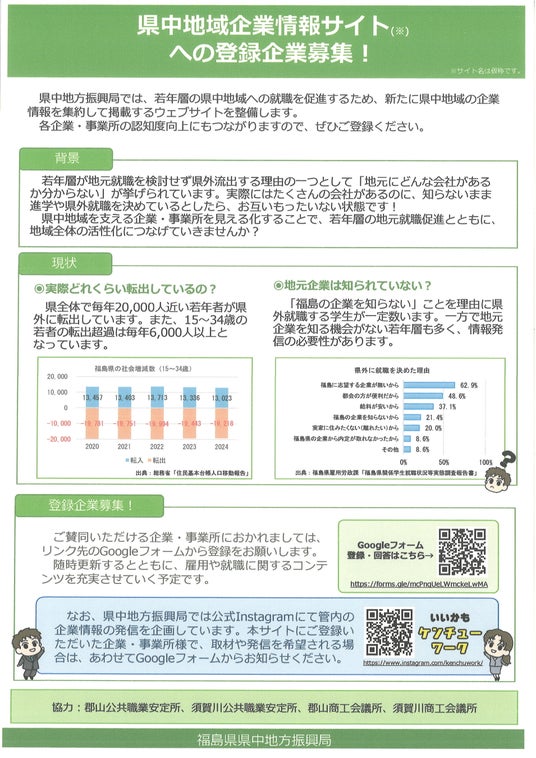 県中地方振興局では、若年層の県中地域への就職を促進するため、新たに県中地域の企業情報を集約して掲載するウェブサイトを整備します。各企業・事業所の認知度向上にもつながりますので、ぜひご登録ください。