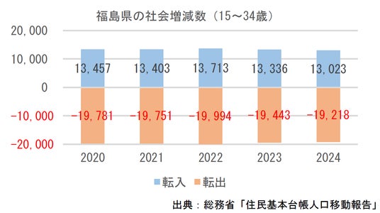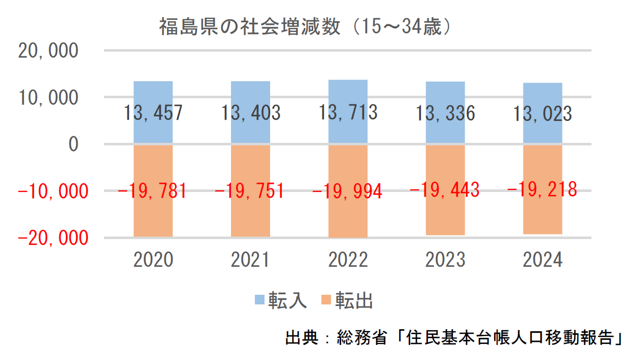 実際にどれくらい転出しているの?県全体で毎年20 ,000 人近い若年者が県外に転出しています。また、15~34歳の若者の転出超過は毎年 6,000 人以上となっています。