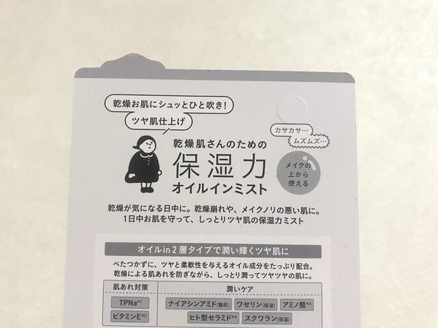 保湿力オイルインミストには、肌に潤いを与える成分と、肌荒れ対策の成分が含まれています。