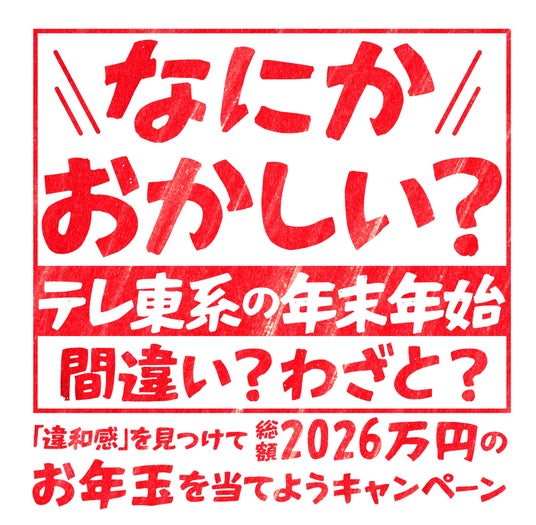 12/27(土)~1/3(土)の期間、テレ東系で放送される番組内で一部「なにかおかしい」部分が放送されてしまいます。皆様にも番組のチェックにご協力いただき、「なにかおかしい」部分をキャンペーン公式 HP からご報告いただけないでしょうか?