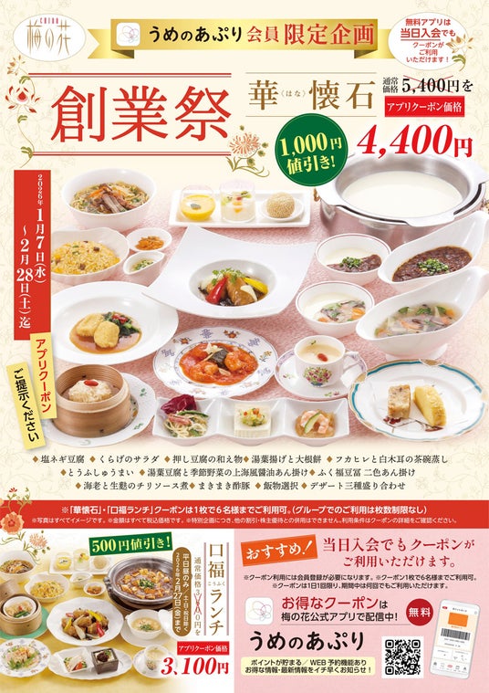 株式会社梅の花サービス(本社:福岡県久留米市、代表取締役:野田安秀)が運営する「創作中華の店 チャイナ梅の花」では日頃のご愛顧への感謝を込めて、2026年1月7日(水)~2月28日(土)の期間中、公式アプリ会員様限定の創業祭を開催いたします。