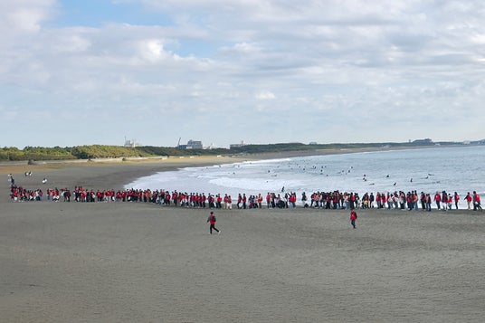 【神奈川県・大磯町】海岸に一直線に並び、一歩ずつ前進してマイクロプラスチックを回収。