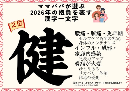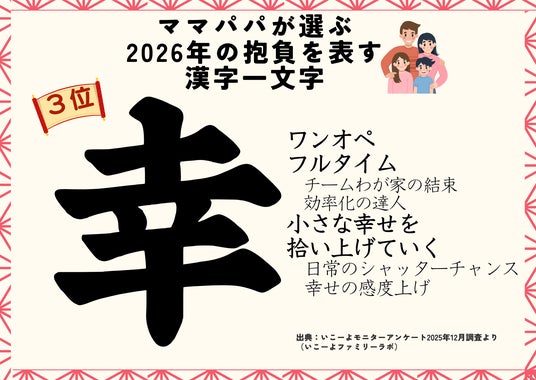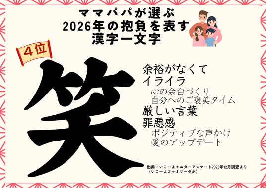2026年の抱負を表す漢字の1位は「楽」。「毎日を楽しく過ごしたい」という前向きさと、「家事・育児・仕事を少しでも楽にしたい」という切実さが重なり合う、子育て世帯ならではの“ダブルミーニング”な「願い」が浮き彫りになりました。