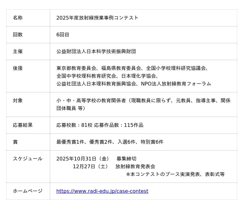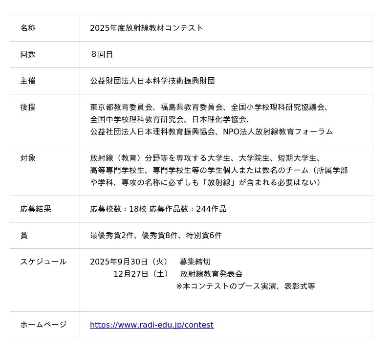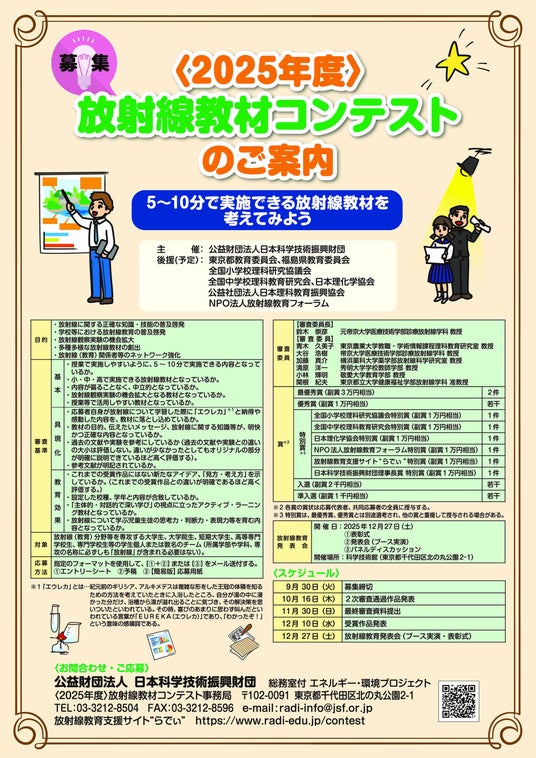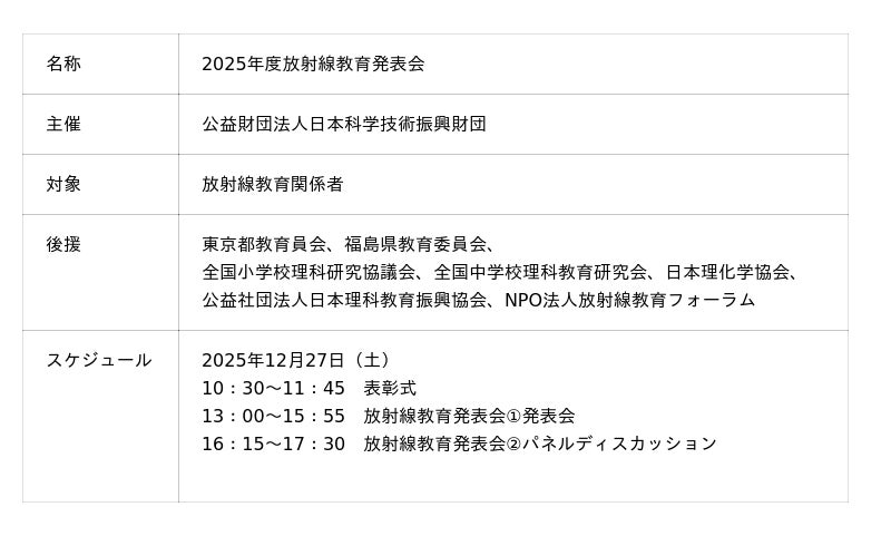 後 援:東京都教育委員会、福島県教育委員会、全国小学校理科研究協議会、全国中学校理科教育研究会、日本理化学協会、公益社団法人日本理科教育振興協会、NPO法人放射線教育フォーラム
