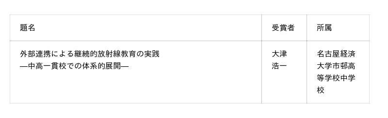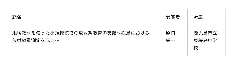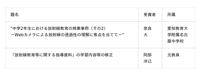 応募内容:小・中・高等学校学習指導要領に、「放射線に関する教育」が取り上げられたことを踏まえ、放射線教育を検討している教員の参考となる企画、実践事例、教材・教具の開発、学習指導案などの放射線授業事例を広く募集