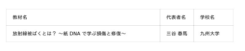 放射線(教育)を学ぶ大学生等を対象に、小・中・高で活用できる放射線教材を広く募集。その教材を教職員の方々にご紹介することによって放射線教育の輪が広がっていくことを願って、放射線教材コンテストを毎年実施しています。この度、以下のとおり受賞作品が決定しましたので発表いたします。