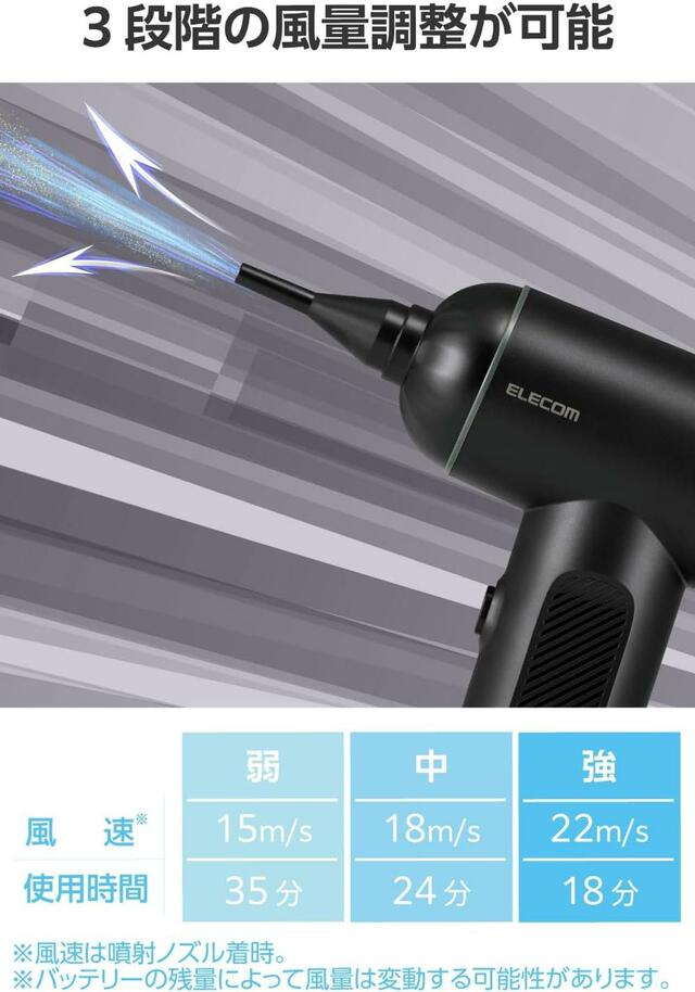 風力は3段階調節に対応し、用途や場所に応じた最適なパワーコントロールが可能。逆さ噴射もできるため、角度を選ばず使えるのは便利です。連続作動時間は約35分(弱モード時)と長く、LEDランプでバッテリー残量も確認できますよ。