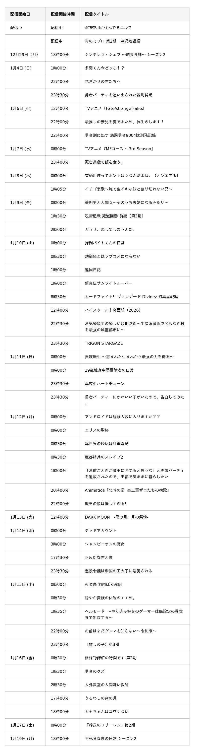 株式会社ドワンゴは、同社が運営する「ニコニコチャンネル」およびライブ配信サービス「ニコニコ生放送」にて配信する2026年冬アニメのラインナップを公開しました。