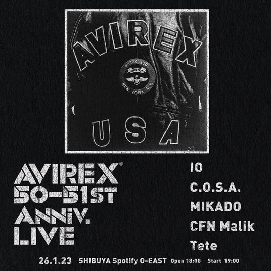 「AVIREX」(株式会社TSI 東京都港区赤坂 代表取締役社長 CEO 下地 毅)は創業50周年のアニバーサリーイヤーを締めくくり、51年目のスタートを飾るライブイベントを開催します。