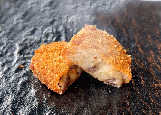 【和牛コロッケ 1個290円】牛肉がゴロゴロ入った和牛の旨みがぎゅっと詰まった、ほくほく贅沢コロッケ。(5個セット:1,300円)