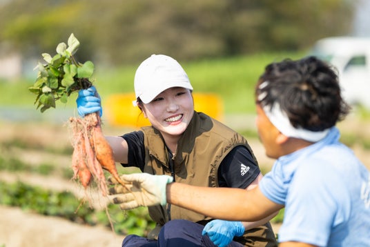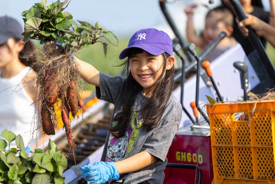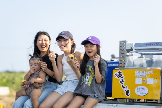 ■農業体験:サツマイモ堀り、専用車試乗、トラクター試乗、焼き芋の実食まず訪れたのは、サツマイモ、玉ねぎ、エシャレットなどをできるだけ自然な形で育てている伊熊さんの畑です。参加者は農家にサツマイモの生態や掘り方などをレクチャーしてもらい、手堀り、機械掘り(芋ほり専用機械ポテカルゴ)、1年貯蔵芋と新芋の食べ比べ、トラクターへの試乗を体験しました。