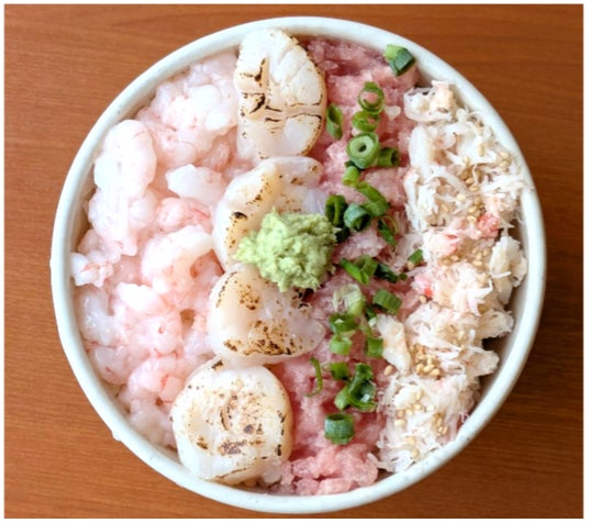 「お祝い4種丼セット」ねぎとろ、甘エビ、炙りホタテ、蟹を組み合わせたバラエティ豊かな丼です。