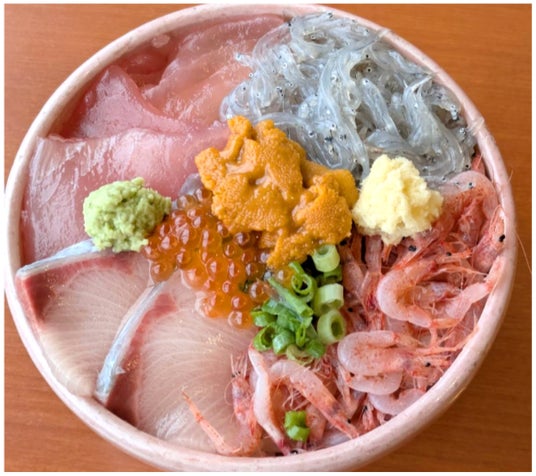 「お祝い6種丼セット」しらす・桜えび・鮪・ぶり・うに・イクラと6種の具材を楽しめる豪華な一皿です。