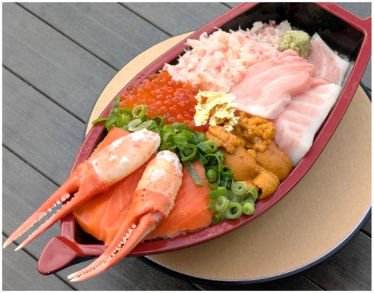 「お祝い7種宝船セット~金粉入~」7種類の食材を船盛丼でご提供し、ご提供時に回転させてお渡しいたします。お祝い気分を盛り上げる一品です。