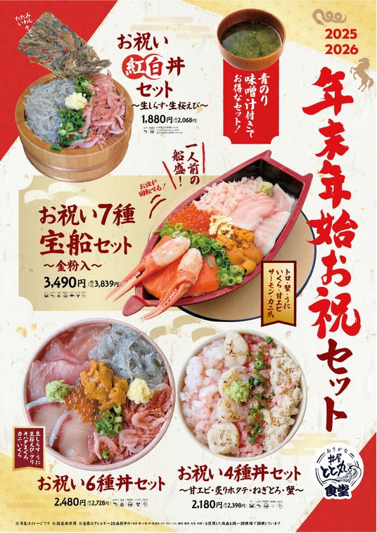 駿河湾沼津サービスエリア上り線・おさかな丼屋とと丸食堂(所在地:静岡県沼津市)は、年末年始限定の新商品として「お祝い紅白丼セット」「お祝い4種丼セット」「お祝い6種丼セット」「お祝い7種宝船セット~金粉入~」を2025年12月27日より順次発売いたします。