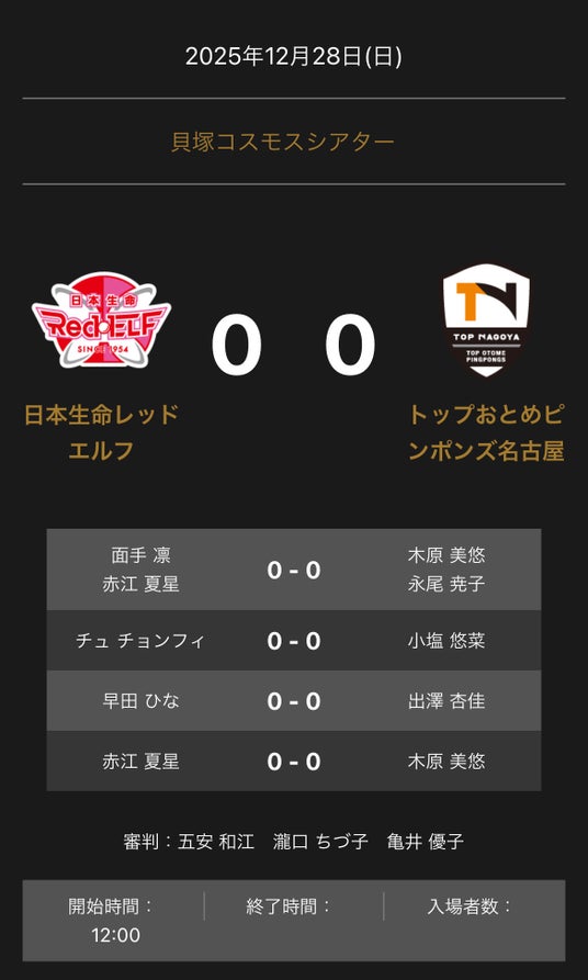 ノジマTリーグ 2025-2026シーズン 公式戦 12月28日開催 日本生命レッドエルフ vs トップおとめピンポンズ名古屋の対戦オーダーを発表いたします。