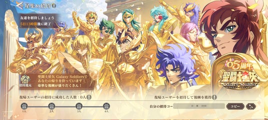 株式会社ファイブクロスは、スマートフォン向けRPG『聖闘士星矢 Galaxy Soldiers』(聖闘士星矢GSS)において、サービス開始0.5周年を記念したイベントを開始したことをお知らせいたします。