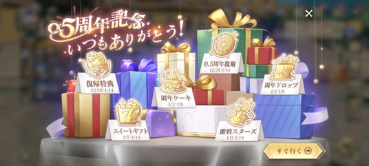 入り口:メイン画面(右上)⇒0.5周年イベント⇒復帰特典