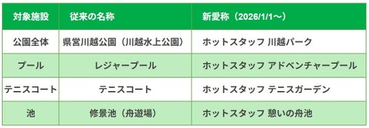 株式会社ホットスタッフ川越(本社:埼玉県川越市、代表取締役社長:仲津 誠)は、県営 川越公園(川越水上公園)」および園内3施設のネーミングライツを取得いたしました。